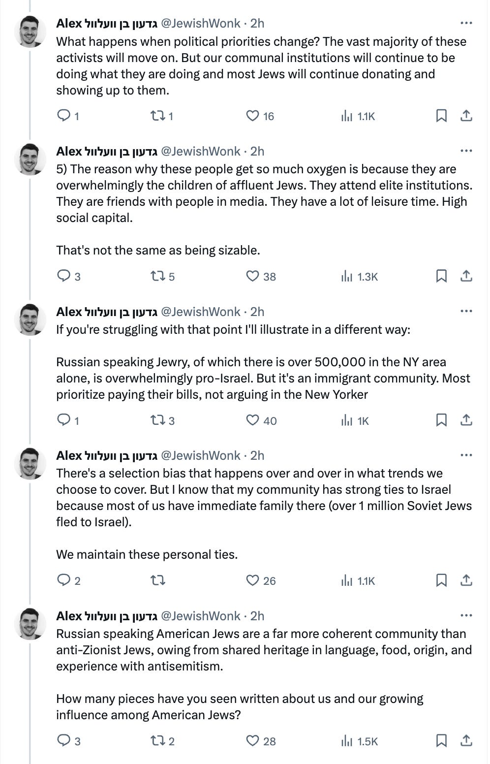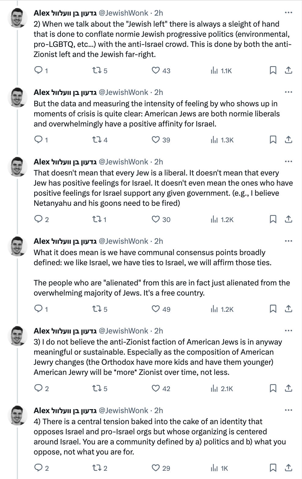→What do people mean when they say the “Jewish left”? That’s the topic of our Thread of the Day, from Jewish Forward columnist Alex Zeldin, who is responding to a recent essay in The New York Review of Books on “the Jewish left’s estrangement from mainstream Jewish institutions.” We suspect we’re more pessimistic than Zeldin about what “normie liberalism” has in store for Israel in the long run, but he’s spot-on about the disproportionate influence of a small clique of elite-educated, anti-Zionist Jews with friends in media. The thread is too long to reproduce in full using screenshots, but a link to it can be found here.