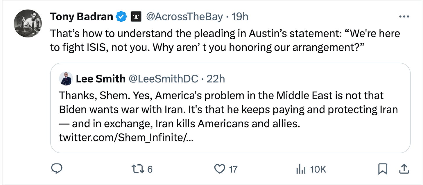 We suppose we would be outraged and deeply saddened, too, if we were in Austin’s position. After all, the United States just a few weeks ago secretly shared sensitive intelligence with the Iranians warning them of an impending ISIS attack on their territory. How did the Iranians repay this kindness? By blaming the United States for the attack, launching ballistic missiles near the U.S. consulate in Erbil, Iraq, and then dispatching its Iraqi goons to kill American troops. As Tablet’s Tony Badran and Lee Smith observed: