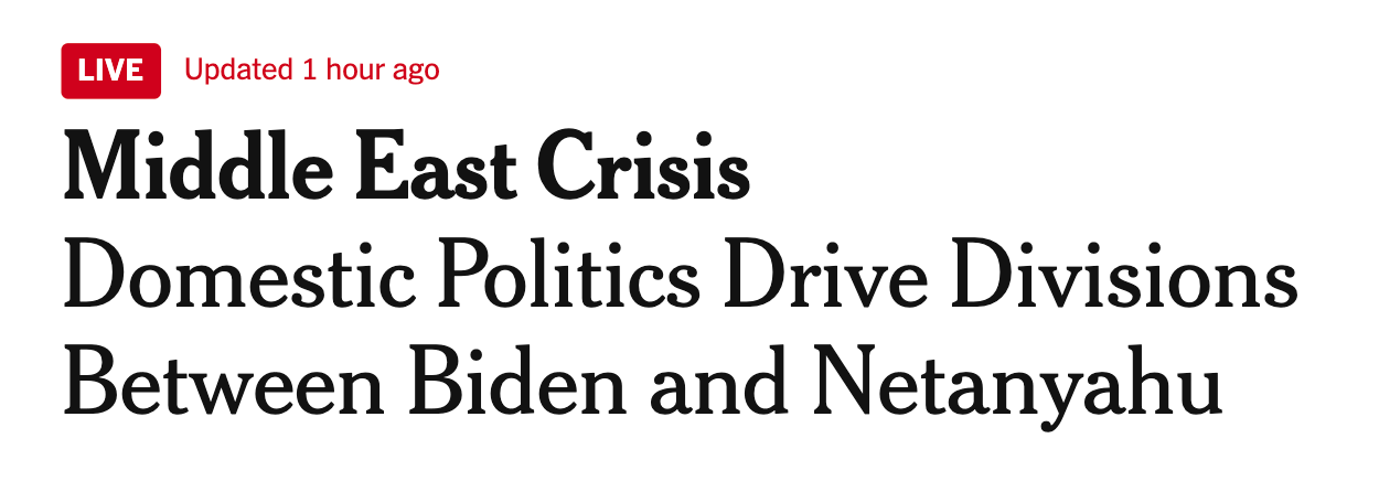Nearly identical stories appeared in The Washington Post, CNN, CNBC, and Axios, with Axios’ Barak Ravid providing plenty of color from “anonymous U.S. officials.” White House national security spokesman John Kirby said at a press conference yesterday that he was “perplexed” by Netanyahu’s decision to cancel the delegation; another official added to Ravid that the White House was “puzzled.” Perplexed and puzzled! Still another anonymous U.S. official said that Netanyahu was “afraid we might offer something reasonable” as an alternative to Israel’s planned invasion of Rafah and chided Bibi’s move as ungrateful: “It’s a funny way to treat a partner that has given Israel so much support.” Oh, and three officials assured Ravid that the whole thing was “an artificial crisis manufactured by … Netanyahu for domestic political reasons.”