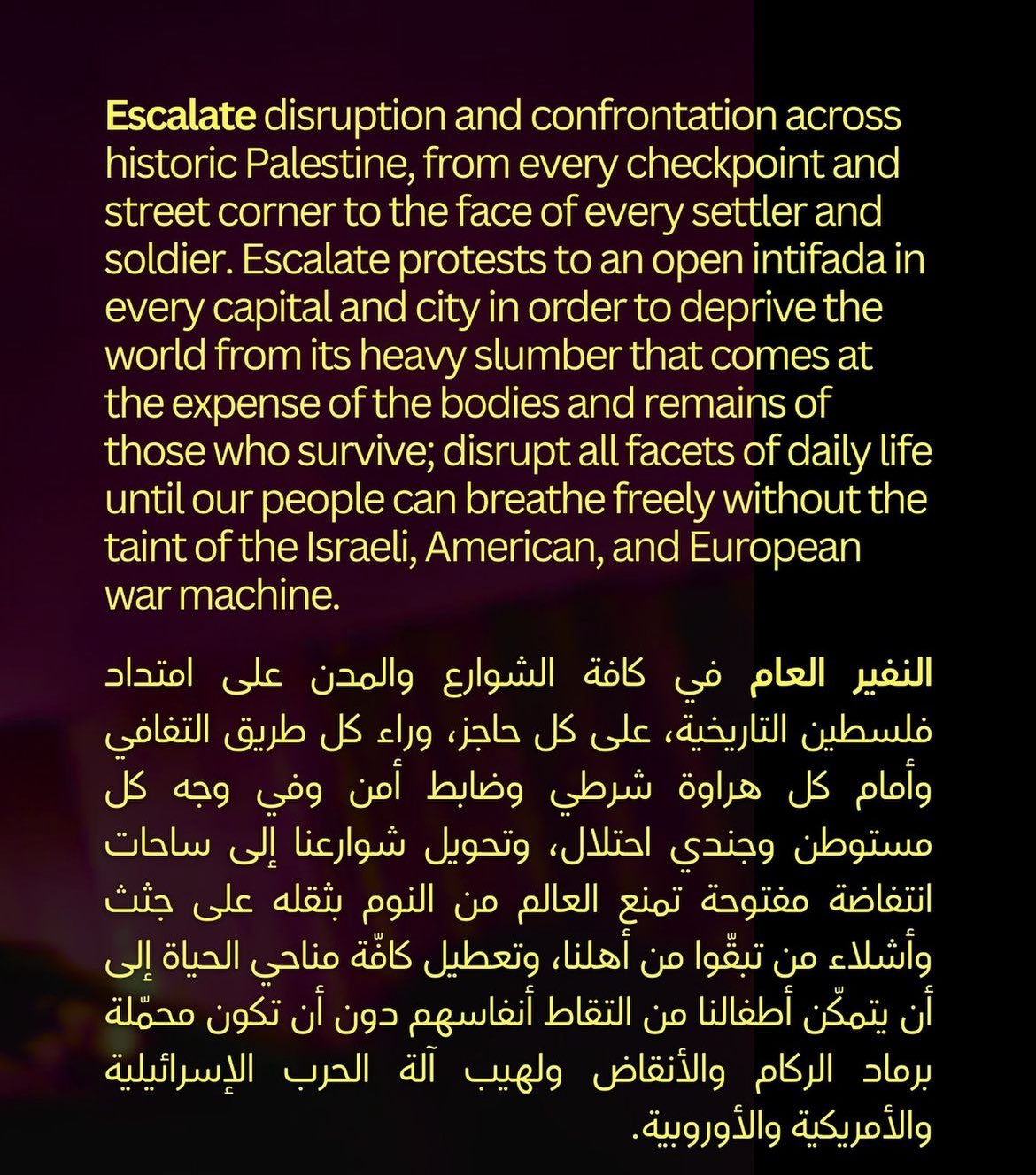 →News of the fake massacre also prompted a call for “escalation” that appears to have originated with Writers Against the War on Gaza, another group on the People’s Conference for Palestine steering committee, and was reposted throughout radical networks on Monday: