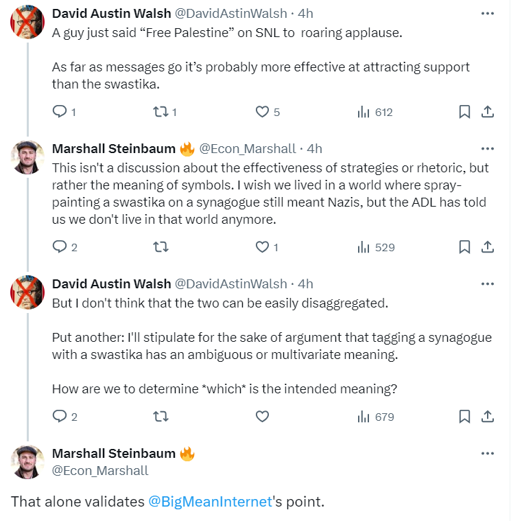BigMeanInternet, by the way, is the X handle of writer Malcolm Harris, and his point was that a swastika on a synagogue now signifies a “condemnation of genocide,” due to Israel. Harris is a signatory of the Writers Against the War on Gaza open letter published in October 2023.
