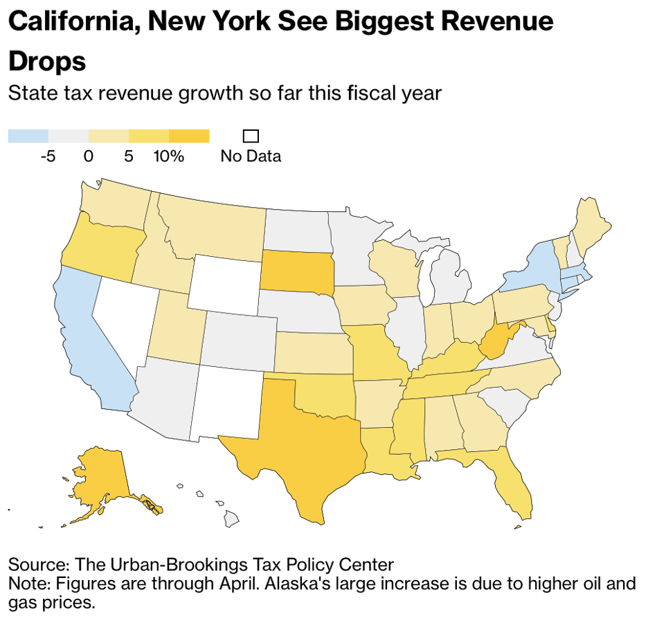 California and New York have lost enough wealthy taxpayers in the past year that their balance sheets are in the red. Meanwhile, Texas and Florida, which have no income tax, are still showing revenue growth off sales tax alone in their thriving economies. While federal money made it look as if California had a surplus over the past few years, the state is actually $32 billion in the hole. Luckily, it’s also stashed away the nation’s largest reserves of cash, at $38 billion.