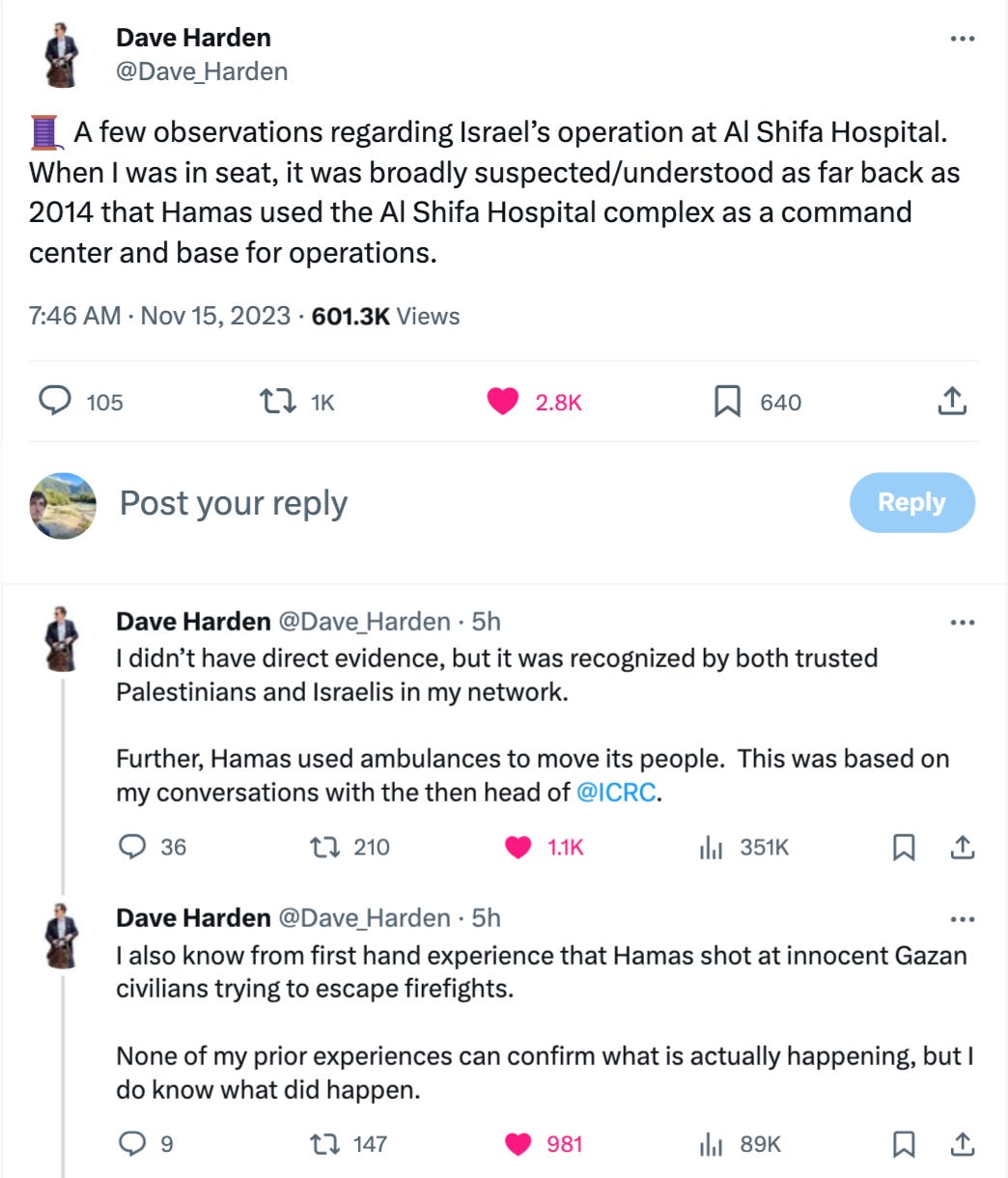 →For more context on Shifa, here’s our thread of the day, from Dave Harden, the former mission director for the U.S. Agency for International Aid and Development in Gaza and the West Bank. Click through the screenshot below to view the full thread on X:
