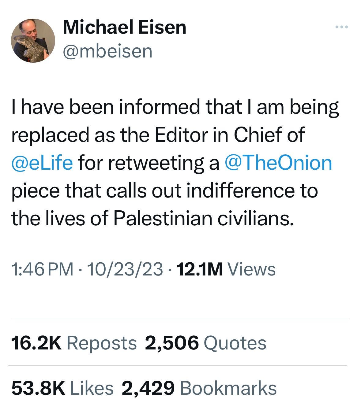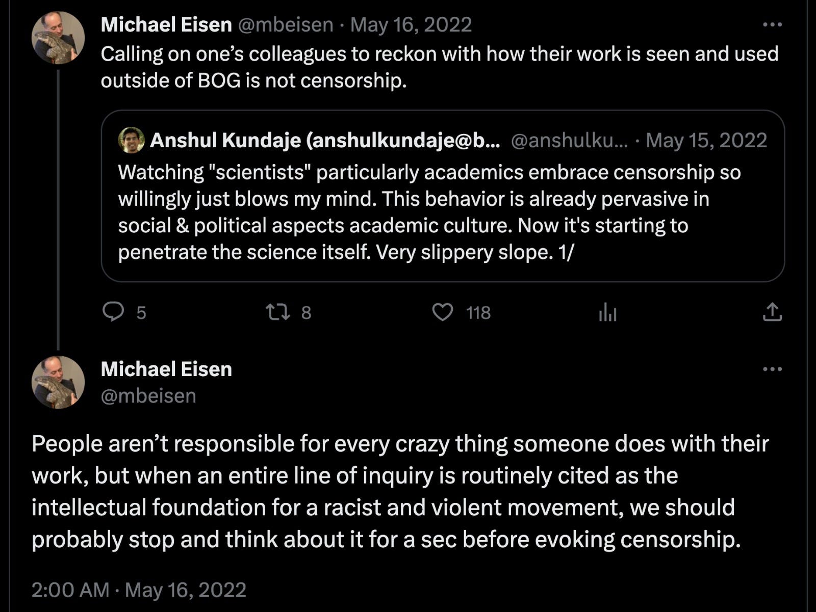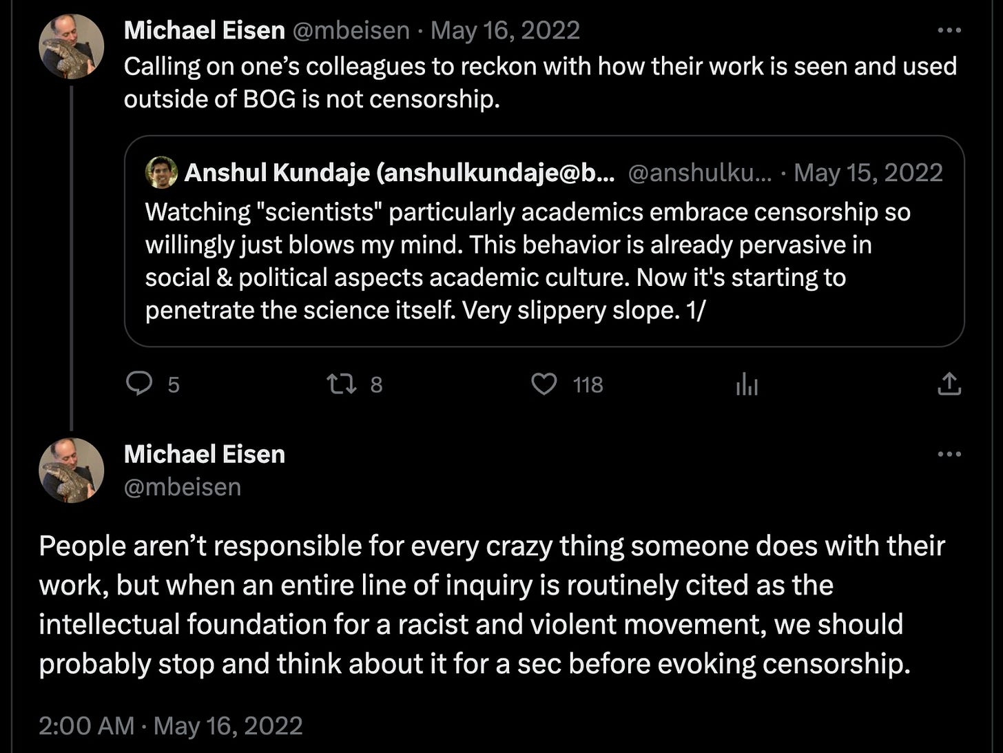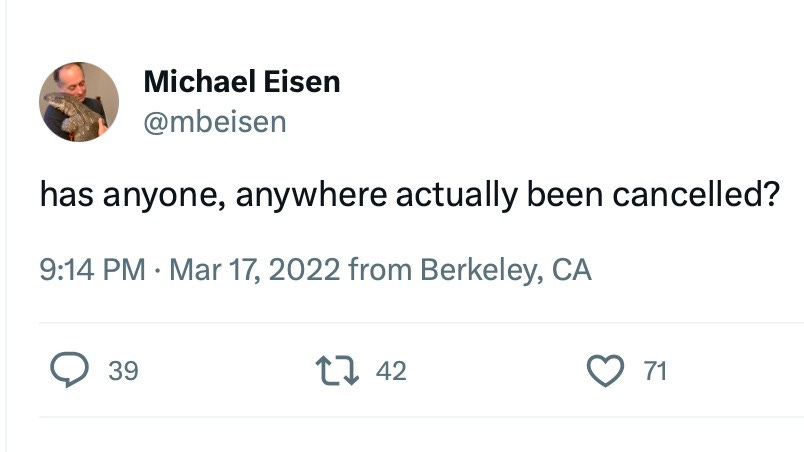 →Many former advocates and apologists for cancel culture—people who either cheered on the use of institutional power to punish dissent and enforce groupthink or denied it was taking place—now seem to be caught off guard by a countermobilization that is directing the tactic back at their side. We at The Scroll pity such people and hope that their fates might provide a useful lesson about the importance of maintaining neutral institutions in liberal societies. To illustrate this point we present the case of Michael Eisen, a comedy in five acts.